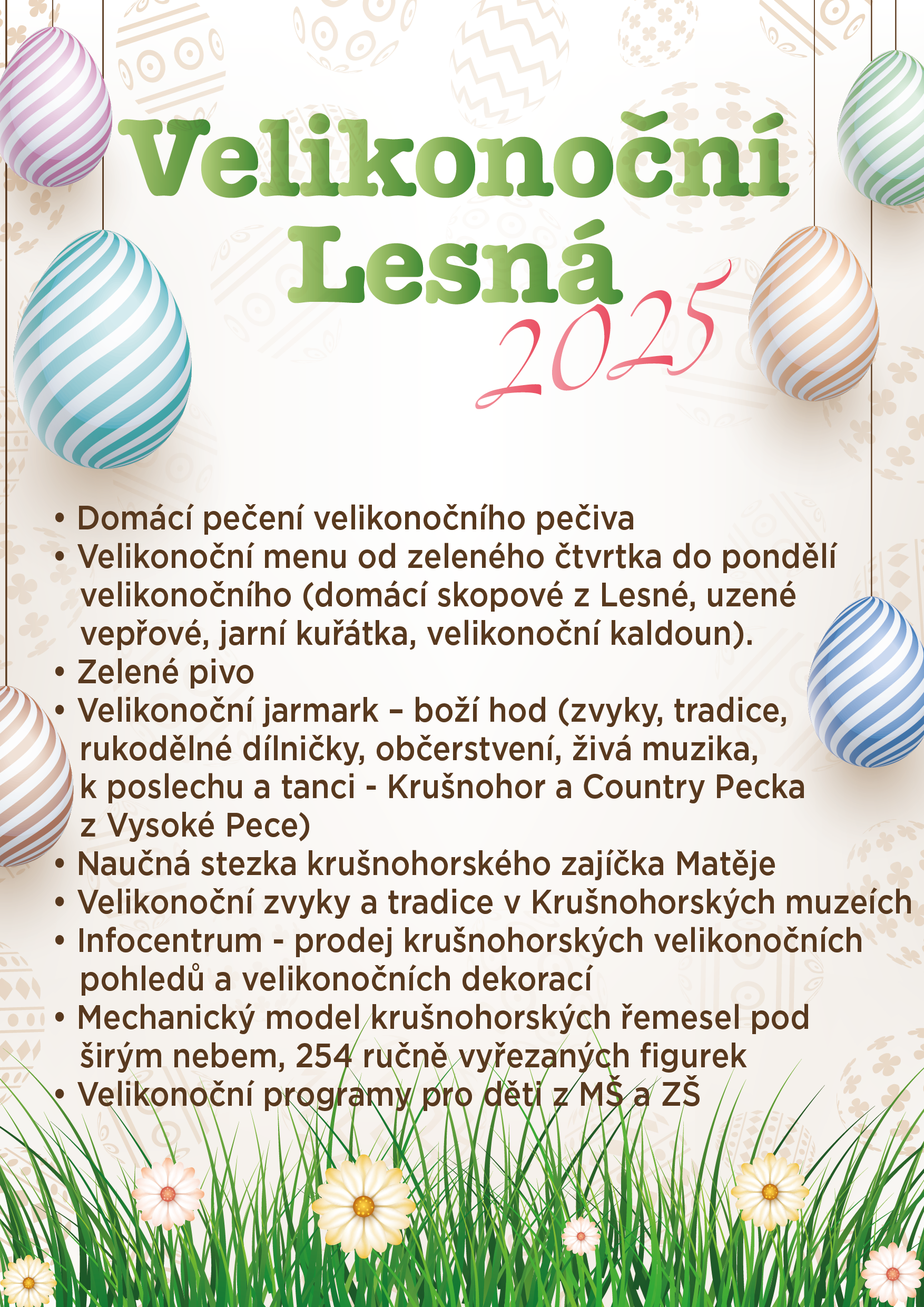 Velikonoce se pomalu, ale jistě blíží a my jsme si letos pro všechny zájemce připravili spoustu možností a akcí s velikonoční tématikou a v období Velikonoc. Postupně budeme jednotlivé plakáty zveřejňovat, těšit se můžete na Velikonoční jarmark, zelené pivo, velikonoční menu v naší lesenské restauraci. Těšit se můžete také na velikonoční naučnou stezku a spoustu dalšího!
