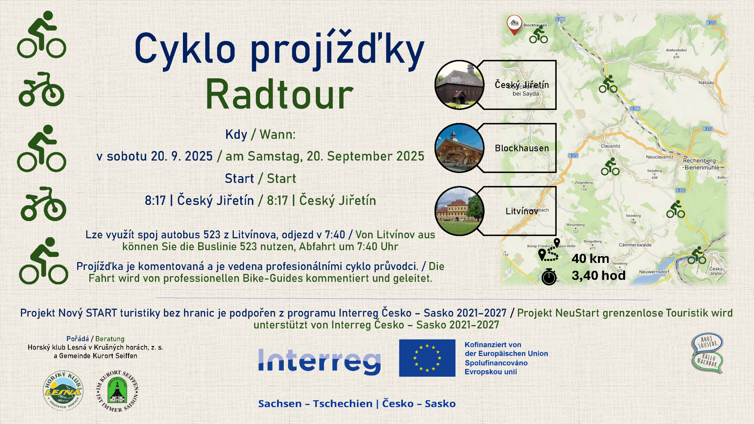 V případě zájmu se, prosím, přihlaste nejpozději do pátku 19. 9. 2025 do 12:00 hod. telefonicky na čísle 476000334 (7:00 – 15:00 hod.), nebo e-mailem na info@horskyklublesna.cz.