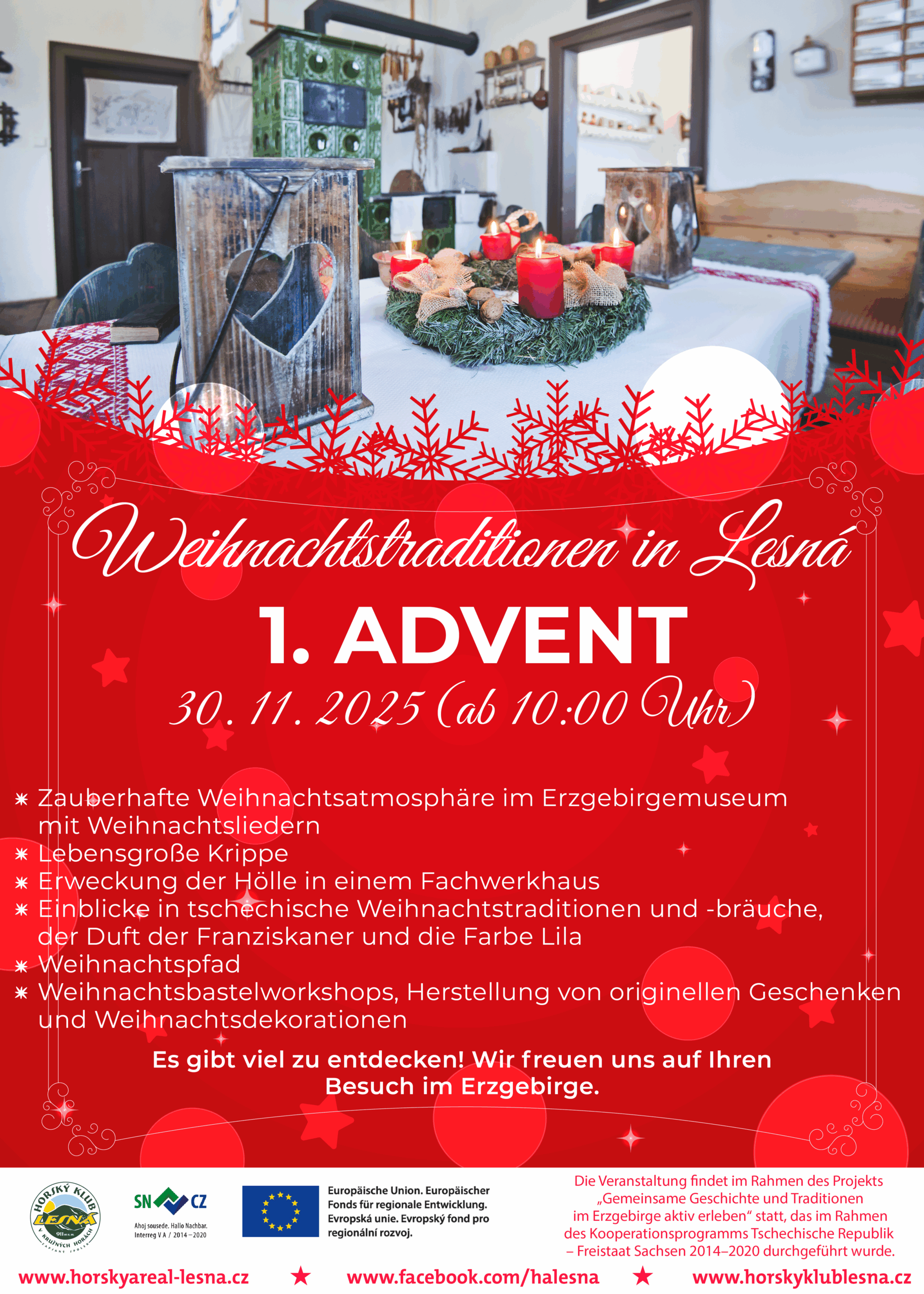 Po roce tu máme opět nejkrásnější svátky v roce, které se nezadržitelně blíží! Již v neděli 30. 11. 2025 začínáme 1. Adventem u nás v Lesné! Přijďte nasát kouzelnou vánoční atmosféru do Krušnohorského muzea. Těšíme se na Vás od 10:00 h.