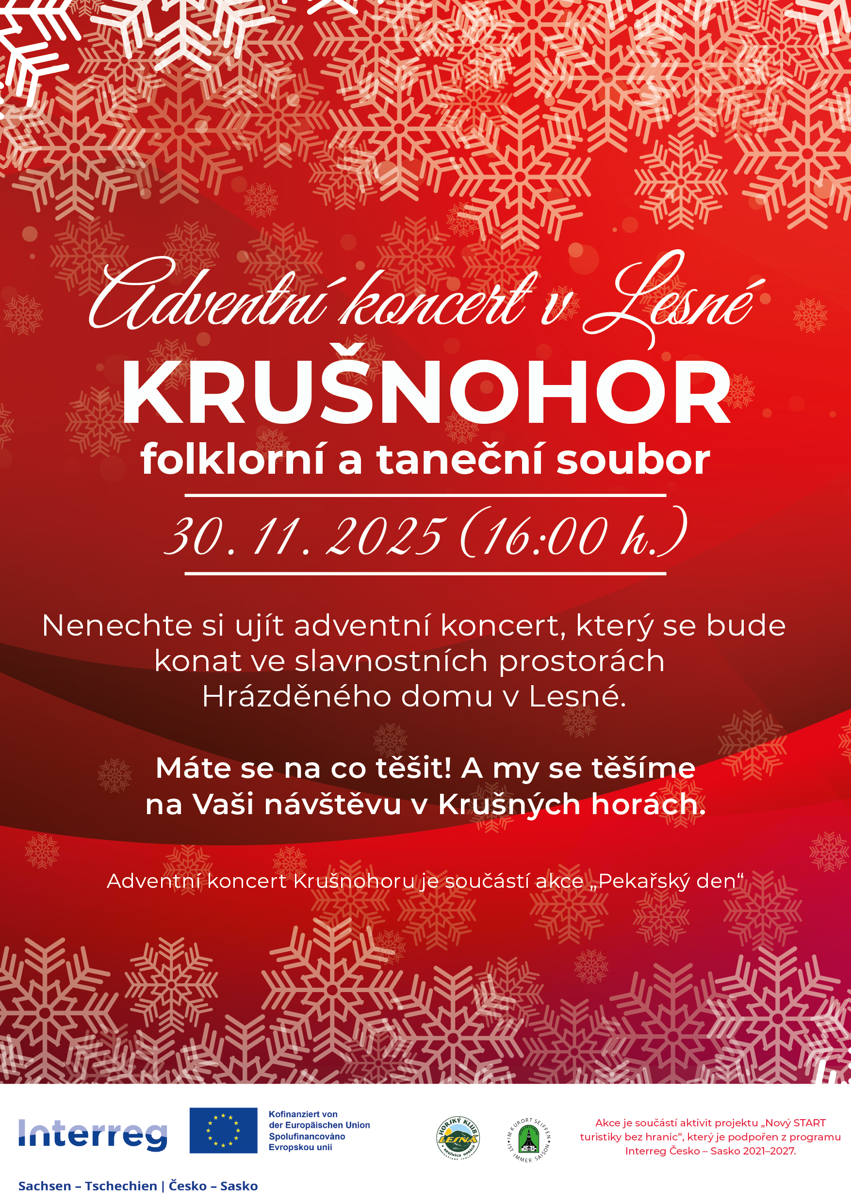 Srdečně Vás zveme na první letošní advnentí koncert folklorního a tanečního souboru Krušnohor, který proběhne v rámci. Pekařského dne tuto neděli od 16:00 h. v prostorách Hrázděného domu v Lesné.